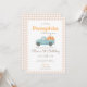 Featuring a cute blue truck filled with pumpkins, warm neutral gingham border, and elegant autumn tones — perfect for a baby boy’s fall celebration.