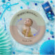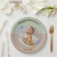 Happy Birthday paper plates celebrating Our Shooting Star's First Birthday. The paper plate features a circular photo of your child surrounded by whimsical blue shooting stars on a green and brown background. Happpy Birthday paper plates is gender neutral and is adorned with script calligraphy. It is a minimalistic and modern paper plate and the stars add to the a simple yet magical touch. Customise with your own details.