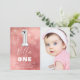 Modern first birthday party invitation designed with a photo of the birthday boy/girl, an ombre watercolor pink background, transparent bubble confetti, and a big silver number one helium balloon. The child's name is written in big calligraphy white text with a simple birthday template underneath that is easy to customise.