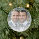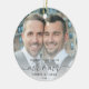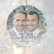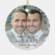 Commemorate the first Christmas of your marriage with this beautiful modern keepsake ornament. The charcoal grey text reads "Our first Christmas as Mr & Mr," with the words "Mr & Mr" in elegant handwriting script with flourishes before and after. Replace the sample image with your favourite photo, and add your last name and the year. A white gradient filter helps make the text pop.