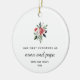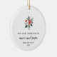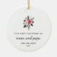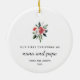 This simple yet stylish holiday ornament says "first Christmas as nana and papa" along with their names and year in modern text and script. An elegant red and white Christmas floral bouquet with poinsettias and green leaves decorates the white background. A gorgeous keepsake for anyone who first welcomed a grandchild this year!