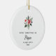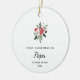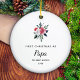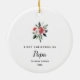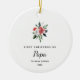 This simple yet stylish holiday ornament says "first Christmas as Papa" along with the baby name and year in modern text and script. An elegant red and white Christmas floral bouquet with poinsettias and green leaves decorates the white background. A gorgeous keepsake for any grandfather who first welcomed a grandchild this year!