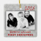 Baby boy photo first Christmas ornament keepsake. Double sided, square tree ornament in gray with red text. Photo template is horizontal with a dark gray border. Year date at the top, with name and “first Christmas” text beneath the photo. On the back more text an be added in white over red. An example could be the home address where the child first lived, or say “Merry Christmas” to make it a gift ornament to the grandparents or relatives.
