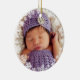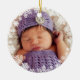 Snowflake framed baby's first Christmas photo ornament design features a round wreath of delicate white snowflakes that frame photo as an overlay design. A custom message appears on the back of the ornament along with a silver coloured background (can be modified). This holiday photo ornament design can be personalised with the baby's name and birth year. White, silvery grey, and violet purple colour scheme can be modified.