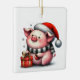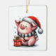 Whimsical illustration of a cute pig in a Santa hat with a wrapped gift printed on a ceramic ornament commemorating baby's first Christmas. Text on back can be changed. AI assisted graphic purchased with commercial use. Artwork: RedHeronLighthouse