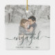Commemorate your engagement with this beautiful modern keepsake ornament. The green text reads "Our first Christmas engaged," with the word "engaged" in elegant handwriting script with flourishes before and after. Replace the sample image with your favourite photo, and add your names and the year. A white gradient filter helps make the text pop.