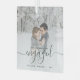 Commemorate your engagement with this beautiful modern keepsake ornament. The dark green text reads "Our first Christmas engaged," with the word "engaged" in elegant handwriting script with flourishes before and after. Replace the sample image with your favourite photo, and add your names and the year. A white gradient filter helps make the text pop.