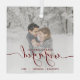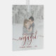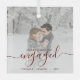 Commemorate your engagement with this beautiful modern keepsake ornament. The dark red text reads "Our first Christmas engaged," with the word "engaged" in elegant handwriting script with flourishes before and after. Replace the sample image with your favourite photo, and add your names and the year. A white gradient filter helps make the text pop.