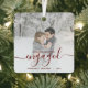 Commemorate your engagement with this beautiful modern keepsake ornament. The dark red text reads "Our first Christmas engaged," with the word "engaged" in elegant handwriting script with flourishes before and after. Replace the sample image with your favorite photo, and add your names and the year. A white gradient filter helps make the text pop.