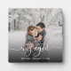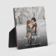 Commemorate your engagement with this beautiful modern keepsake plaque. The white text reads "Our first Christmas engaged," with the word "engaged" in elegant handwriting script with flourishes before and after. Replace the sample image with your favourite photo, and add your names and the year. A black gradient filter helps make the text pop.