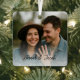 Celebrate love and new beginnings with this personalised "Our First Christmas Engaged" photo ornament. Designed in a timeless round ceramic style, this keepsake features elegant calligraphy, festive winter greenery, pinecones, and white florals. The front displays a custom engagement photo with the phrase “Our First Christmas Engaged” with the year, while the back offers space for a second photo and the couple’s names, making it a truly meaningful and unique holiday treasure. Perfect as an engagement gift, Christmas proposal keepsake, or holiday décor for couples, this ornament is a heartfelt way to commemorate your engagement and the start of forever.