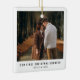 Experience the elegance of a chic, understated photo ornament for the holiday season. Adorned with timeless typography that reads "Our first Christmas engaged" in a sleek black hue, this ornament stands out against a pristine white backdrop. Personalisation options allow you to customise the photo, greeting, and name, adding a unique touch. Make a stylish statement with this minimalist, modern Christmas design, announcing your engagement to loved ones. The illustrated image serves as a placeholder, ready to be replaced with your own cherished photo.