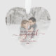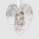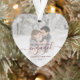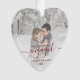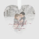 Commemorate your engagement with this beautiful heart-shaped keepsake ornament. The dark red text reads "Our first Christmas engaged," with the word "engaged" in elegant handwriting script with flourishes before and after. Replace the sample image with your favourite photo, and add your names and the year. A white gradient filter helps make the text pop.