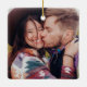 For your first Christmas engaged this personalised rustic holiday ornament features hand drawn cow skull with a blush pink floral head dress of delicate roses on a background of white and grey weathered wood.. Below it reads in silver grey modern script typography "Our First Christmas engaged" with your first names and year to customise. The back of the ornament features a photo for you to change to your own. Best of luck on your future wedding! Designed by artist ©Susan Coffey.