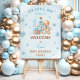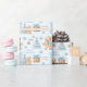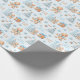 Christmas wrapping paper with a cute gingerbread man, Christmas tree, gifts and snowflakes for the first Christmas or for the 1st Christmas Birthday of a baby boy with the name and two other different texts, easily personalise them. The light blue background. - Kate Eden Art