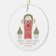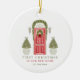 Celebrate the first Christmas in your new home with this cute watercolor design with an illustration of a red door - decorated for the holiday season and two Christmas trees.
