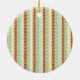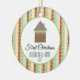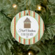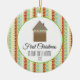 First Christmas in our new home has a vertical striped patterned background with various shades of red and green. The ornament is accented with a graphic of a house with Christmas light along the bottom of the roof. Customisable text allows you to change the year.