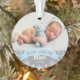 "My First Christmas" banner and snowflake border photo ornament design can be personalised with the baby boy's name and birth year. Includes a second photo on the back. Light blue, grey and white colours.