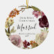 Celebrate your first Christmas as a married couple with this elegant, boho floral wreath photo ornament. The wreath has burgundy, pink and warm orange flowers with green foliage accents. Easy to customise with your names and year on the front and your photo on the back.