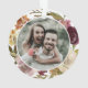 Celebrate your first Christmas as a married couple with this elegant, boho floral wreath photo ornament. The wreath has burgundy, pink and warm orange flowers with green foliage accents. Easy to customise with your names and year on the front and your photo on the back.