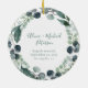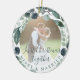 Watercolor green foliage eucalyptus greenery leaves wreath and a classy trendy handwritten style calligraphy script making a beautiful modern wedding newlyweds couple photo personalised keepsake Christmas tree ornament template. ++++++++++++ Easy to replace the photo with your own! You can change the script text with yours.