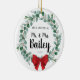 Gift this sweet ornament to your favourite newlyweds for their first Christmas as Mr. and Mrs. Customise the text on the front. Holiday ornament features eucalyptus greenery and a red bow. Festive and fun newlywed gift. Great for bridal shower gift too!