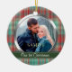 This holiday keepsake ornament features your own photograph within a Christmas red and green plaid pattern frame which has an inside silver lining. A green banner holds your customised text; make it say whatever you'd like! The other side has the same plaid border with additional text on the white interior. An elegant and festive keepsake gift for newlyweds or any couple.