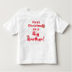 First Christmas Sibling T-shirt design features the phrase, "First Christmas as a "Big Brother!" in bright red letters. "Big Brother" text may be replaced with "Big Sister" or any other text you wish to supply. A Santa hat is displayed balancing on the edge of the letter "B" for Brother and a Christmas wreath hangs playfully on the end of the word Christmas. Tiny green and red speckles are displayed throughout. Designed to accompany the "First Christmas" collection.
