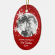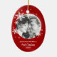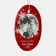 Personalised Christmas ornament with modern design featuring winter white snowflakes on red and round photo. A beautiful keepsake for your first Christmas together!