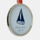 First Christmas Template Ornament. This baby ornament features a navy blue sailboat. The sailboat was painted using watercolor paint. The background is a light baby blue. This is a template design and can be personalised by adding the baby's full name and date of birth.