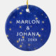 First Christmas together couple ornament featuring two seahorse illustrations. Personalised with the established year and your names on the back. It includes stars and a blue night sky background. If you want to change the colours or font of the text please click the button to edit the design.