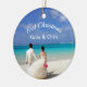 A beach themed wedding ornament commemorating your first christmas together as a married couple. A beautiful couple in their wedding attire as seen from behind. Walking hand in hand down a gorgeous sun drenched tropical beach. White sands, crystal clear blue turquoise waters, a blue sky and a bright sunny day all help to create a perfect and memorable wedding day. Personalise with your names.