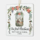 Elegant Calligraphy Script, Our First Christmas Watercolor Winter Floral Deer Ornament includes red poinsettias, white floral roses, pine cones, cotton and winter greenery. Watercolor Mason jar with deer and buck in pines forest. Photo Back.