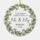 First Christmas Wreath Wedding Ceramic Ornament. Celebrate your first Christmas as a married couple in style. Our customisable template allows you to create a one-of-a-kind ornament that captures the love and joy of this memorable milestone.Add your names, wedding date, or even a special message to make it truly unique. It's the perfect keepsake to cherish for years to come!