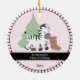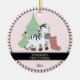 Adorable baby zebra with red/green striped, Christmas stocking and green tree in background. Light pink background for a baby girl. Black banner and striped border around ornament. Template created for you. Perfect for new parents celebrating first child at Christmas!