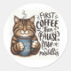 Start your day with cosy vibes and a splash of caffeine-fuelled feline motivation! This adorable crafted sticker features a fluffy tabby cat holding a coffee mug with a content smile, next to the punny phrase "First Coffee, Then Pause Pawssibilities." It’s the perfect sticker for coffee lovers, cat moms, and anyone who starts their day with pawsitive energy.