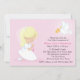 A sweet First Communion invitation with little blonde haired girl dressed in a pretty white Communion dress with veil, kneeling in prayer and holding pink rosary beads. The background is pink and there is a white dove with gold branch. Graphics: https://www.etsy.com/shop/Prettygrafikdesign