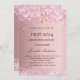 A blush pink gradient background. Decorated with pink faux glitter, confetti and a cross. Personalise and add a name and details. The name is written with a hand lettered style script