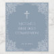 This elegant dusty blue and silver religious design with a vintage air, recommended for a boy's first communion, has an ornate faux silver foil frame with intricate branches with leaves on a dusty blue background. Above the text there is a religious cross, also in faux silver foil. The text has a silvery grey colour similar to the faux silver frame.