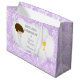 First Communion Brunette Hair Boy Thank You gift bag to present to your guests after the ceremony featuring a Purple Damask pattern.