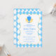 Modern first communion invitation features blue harlequin, cross, and chalice.
