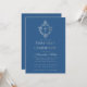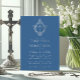 This elegant blue and silver first communion invitation with a vintage air, recommended for a boy, has a vintage floral crest in faux silver foil, that has cross in it, also in faux gold foil. The name of the boy is written in an elegant calligraphic script. The text has a colour similar to the faux silver crest. The background is classic blue.