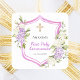 A white background. Decorated with a pink crest, pink and purple flowers, florals. With a golden cross.