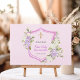 A soft pink background. Decorated with a pink crest, pink and purple flowers, florals. With a golden cross.
