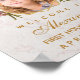 This elegant floral geometric religious design has a replaceable girl photo in an irregular gold frame from two gold hexagons that overlay, with a gold cross at its top and with pink and white orchids left and right. The text under it is golden. The name is written in an elegant calligraphic script, the rest in caps. The background is white marble.