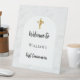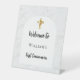 Marble print as background and a white arch shaped frame. A golden cross. Personalise and add a name. Back: no design