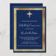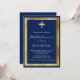 A modern, elegant and invitation. A navy blue background decorated with a cross, faux gold frames. Personalise and add a name and details. White text.