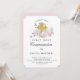 Very pretty First Communion invitation features a gold cross surrounded by blush pink roses and sage green leaves. Traditional fonts give this invitation a classic appearance.