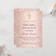 A rose gold faux background. Decorated with rose gold, pink confetti and a cross. Personalize and add a name and details. The name is written with a hand lettered style script