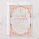 This elegant first communion invitation with a vintage air, recommended for a girl, has an ornate faux rose gold foil frame with elegant baroque decorations on a white marble background. Above the text there is a religious cross in rose gold. Except the occasion "First Holy Communion", that is also in rose gold, all text can be personalised and has a pink colour similar to the rose gold frame.